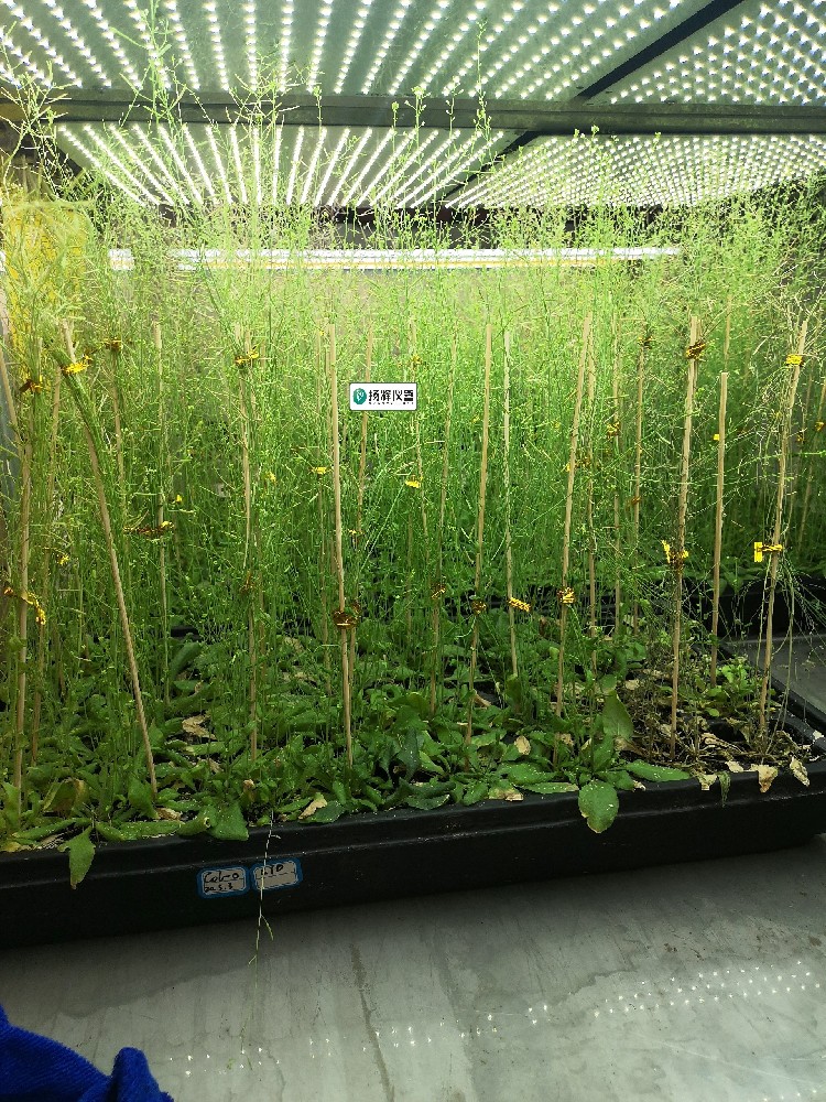 拟南芥在连续照光和 长日下开花加快,短日时开花被阻遏或延迟,这表 明拟南芥开花需要长日照光周期,一般至少12h的光照。在冬季温室中可补充早晚的光照,以满足光周期需要,一般给以16h光照,8h暗期为宜。连续光照可促进生殖循环,略微提早开花,但使叶数减少及降低种生成,而较短日照有利于营养生长。